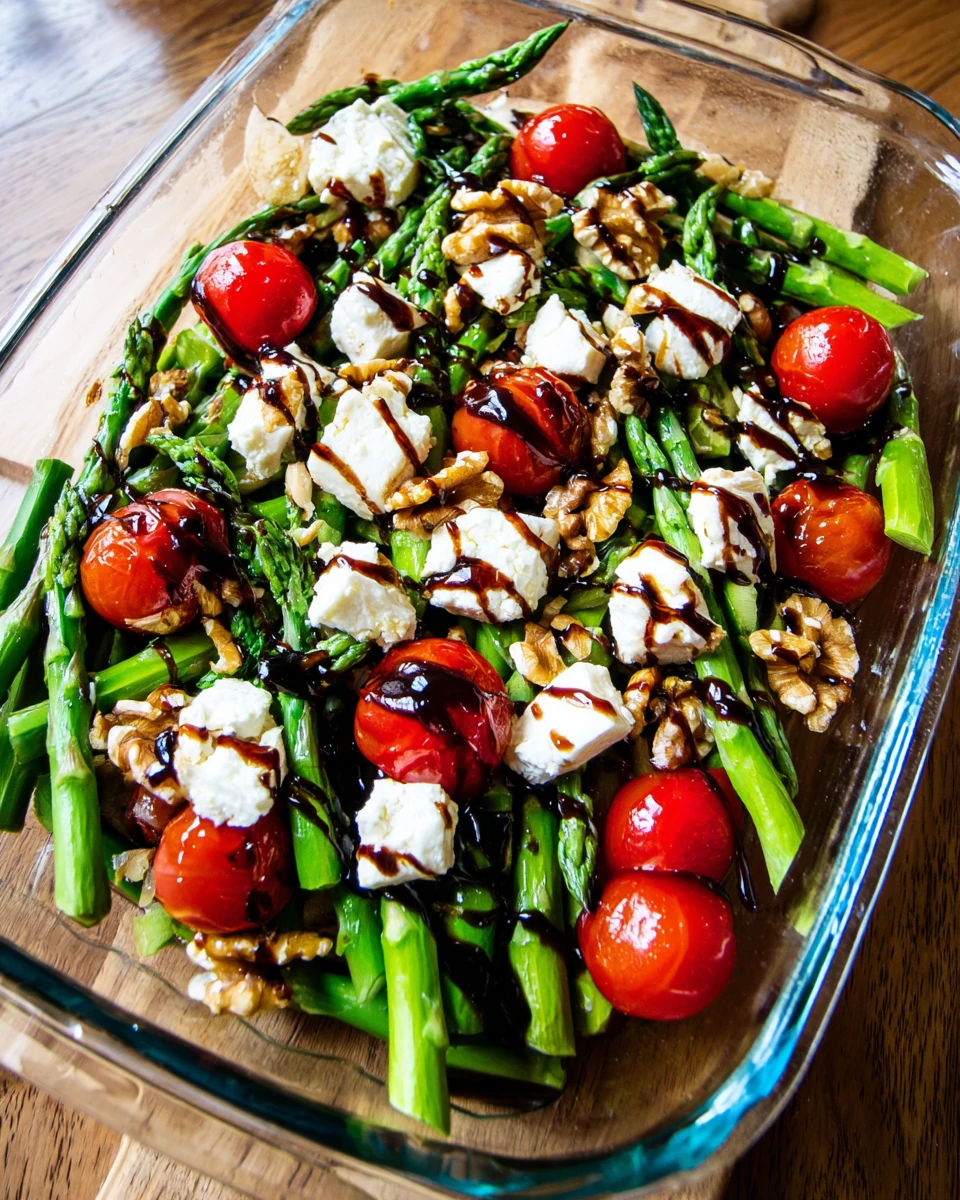A fresh and vibrant salad featuring tender asparagus, juicy tomatoes, and creamy feta, all drizzled with a tangy balsamic vinaigrette.