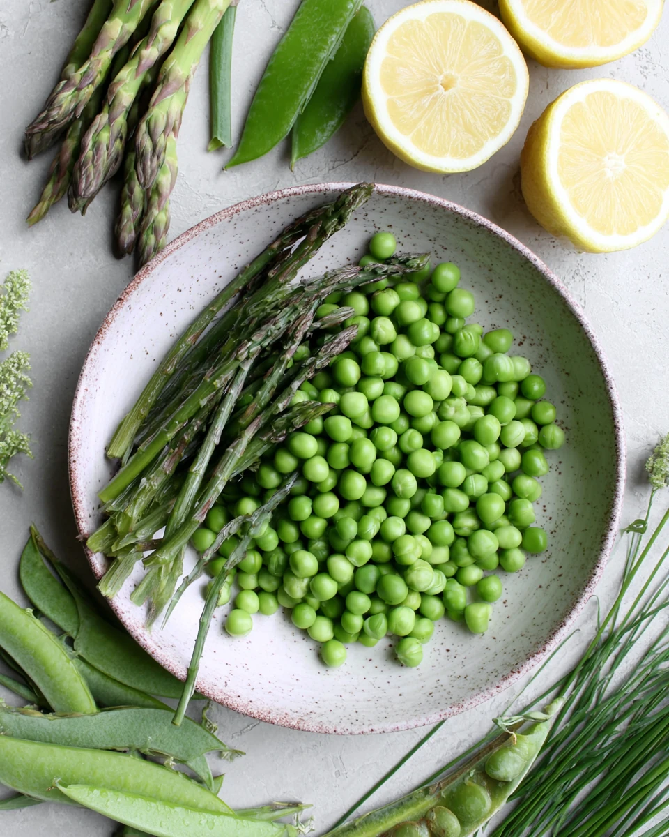 - In a separate skillet, melt the remaining butter over medium-high heat. Add the asparagus and sugar snap peas, sautéing for about a minute until lightly caramelized. Stir in the peas, lemon zest, lemon juice, and a pinch of salt.