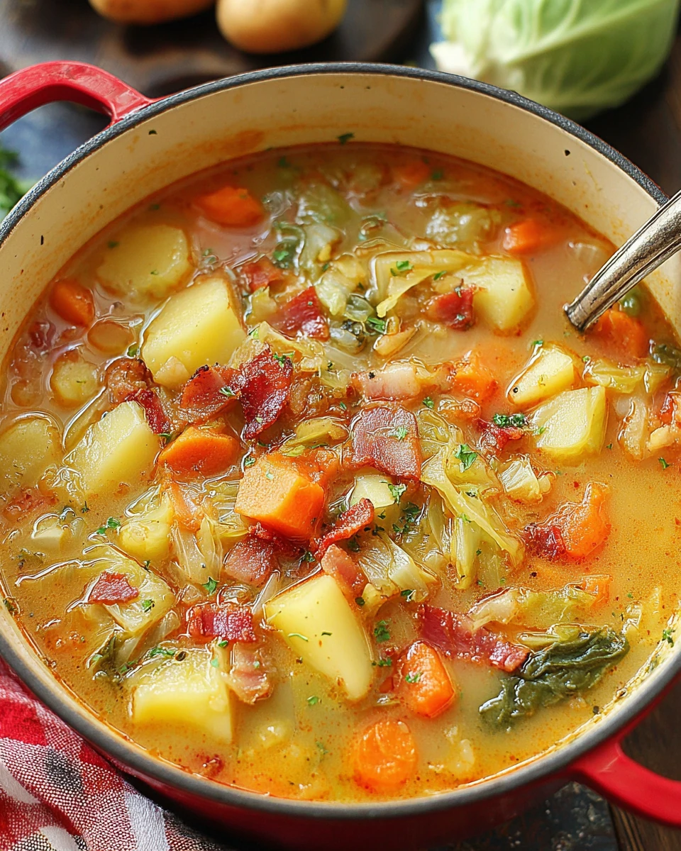 This comforting cabbage soup features crispy bacon and tender vegetables, making it a family favorite.