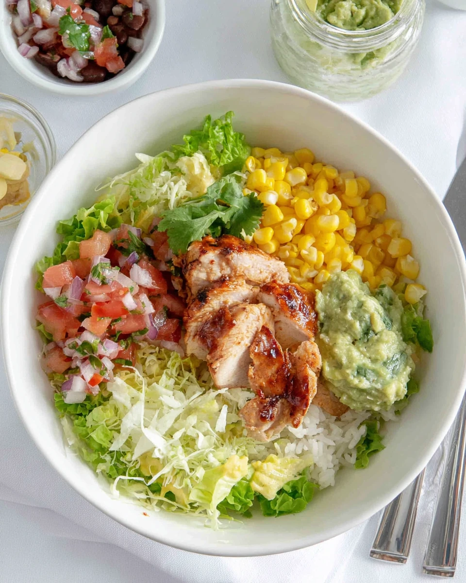 Now it’s time to build your bowl! Start with a base of cilantro lime rice, add your perfectly grilled chipotle chicken, and top with milder salsa, guacamole, corn salsa, and your choice of additional toppings. Each layer brings a new flavor and texture for a truly satisfying meal.