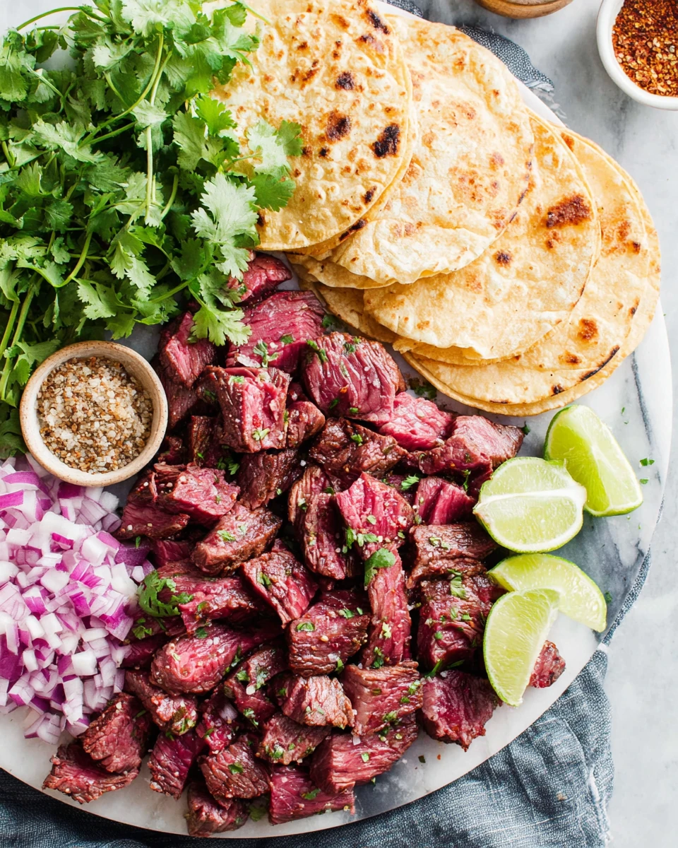 Warm the mini flour tortillas and fill each one with the cooked steak. Top with diced onion and chopped cilantro, then finish with a squeeze of fresh lime. Enjoy your vibrant, tasty tacos!