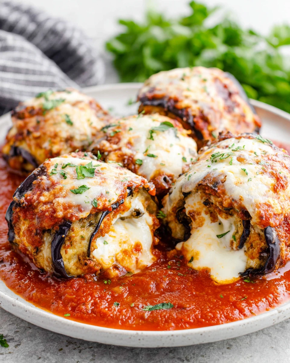 Eggplant rollatini is an Italian dish where thinly sliced eggplant is rolled around a savory filling, typically made with cheese, spinach, and herbs, then baked in marinara sauce.