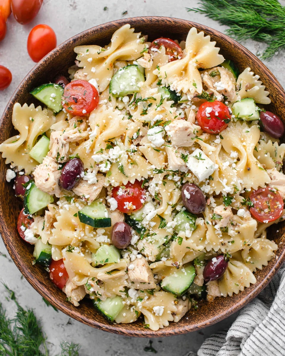 Greek chicken pasta salad with vibrant colors and fresh ingredients.