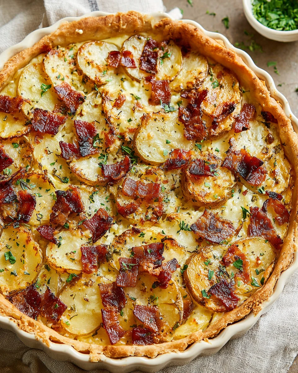 Once the filling is ready, transfer it into the prepared crust. Drizzle the mixture with heavy cream, allowing it to seep into every layer. Bake the pie on the lower rack of the oven for about 35-45 minutes, or until the potatoes are fork-tender and the crust is beautifully golden brown. After baking, let it rest for 10 minutes before garnishing with chopped chives and slicing into servings.