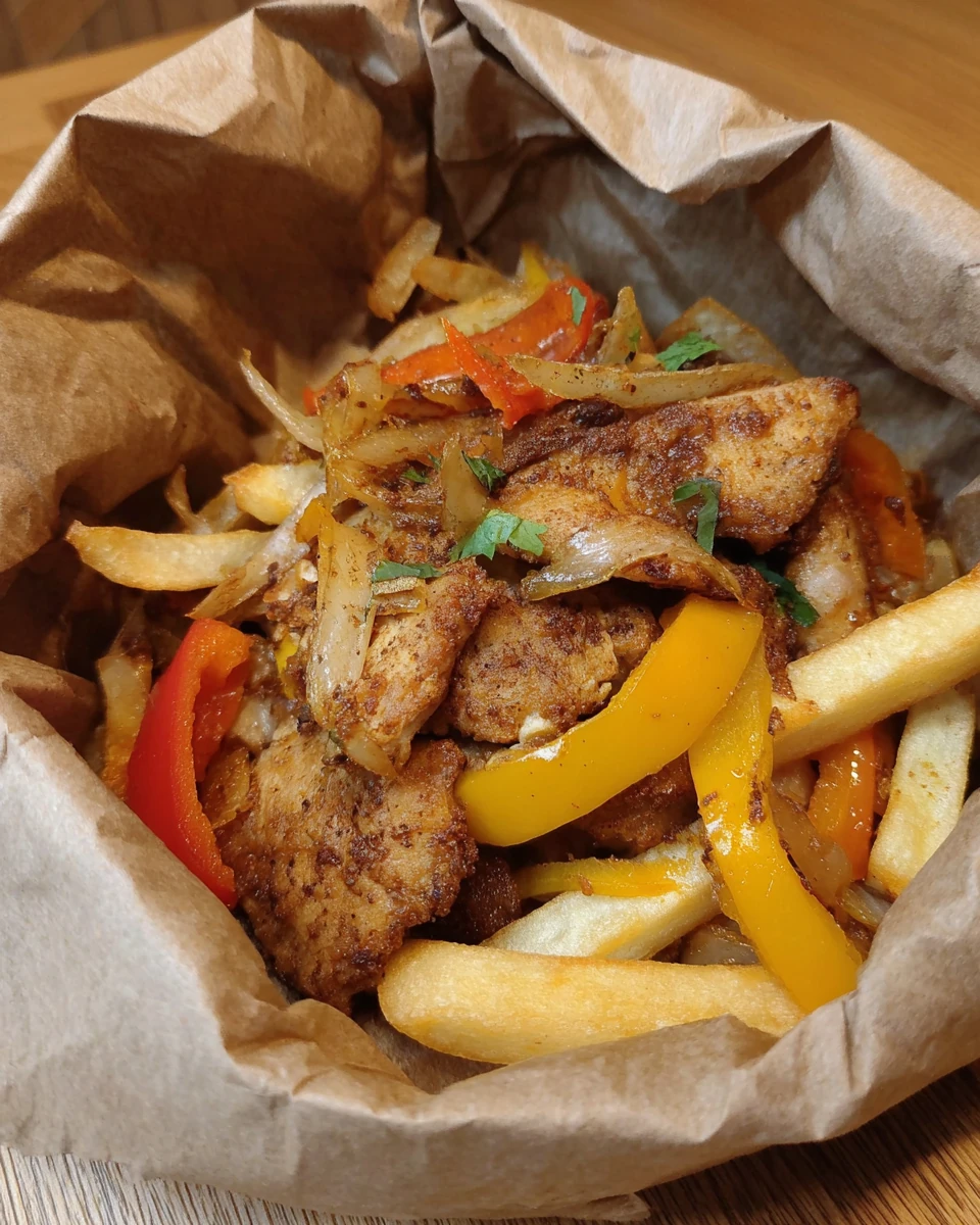 Tasty Irish spice bag with chicken, fries, and peppers.
