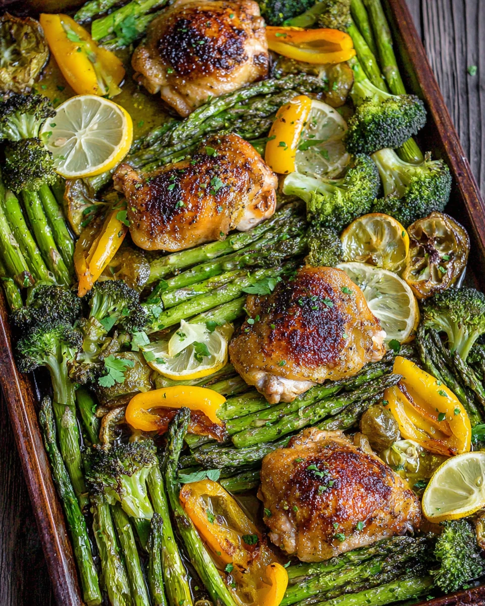 • After 20 minutes, flip the chicken, add broccoli, asparagus, and bell pepper, sprinkle with seasoning, and drizzle more sauce.