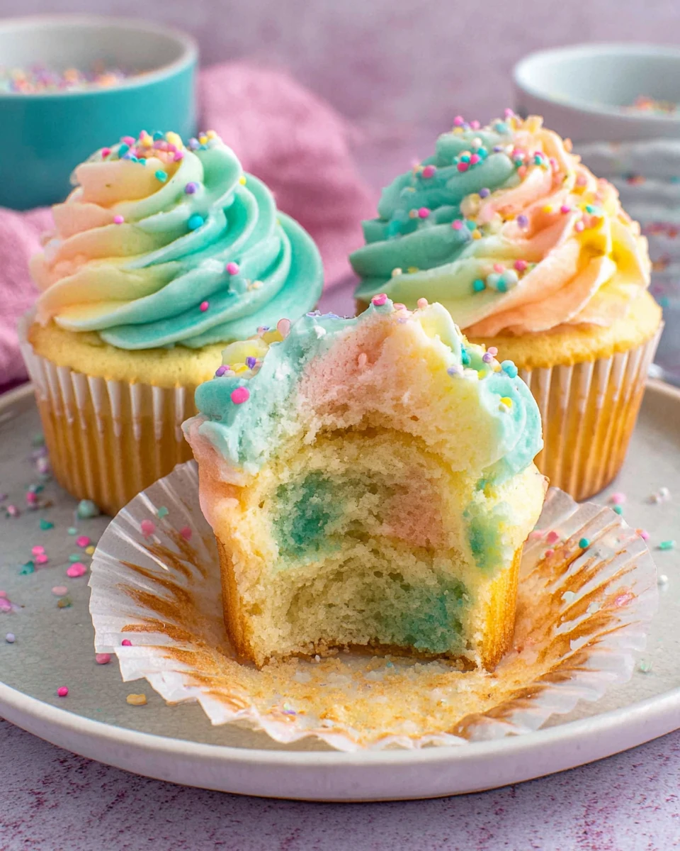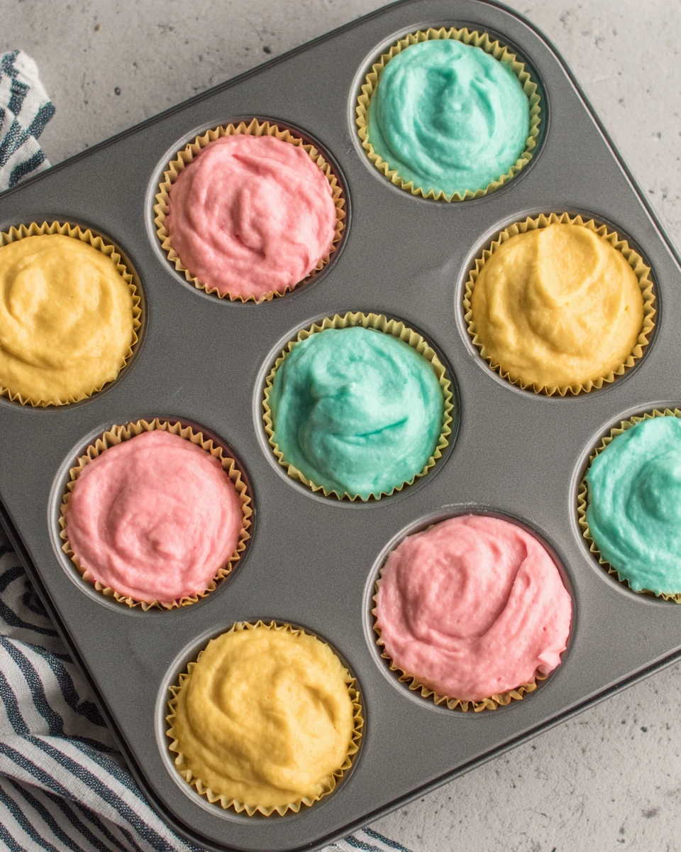 To make the cupcake batter, you’ll need 2 ¼ cups all-purpose flour (270 g), 2 ¼ teaspoons baking powder, ½ teaspoon salt, ¾ cup (12 tablespoons or 1 ½ sticks) butter, softened, 1 ½ cups granulated sugar, 3 large eggs at room temperature, 1 ½ teaspoons vanilla extract, and 1 cup whole milk, also at room temperature. Additionally, prepare pastel gel food coloring in shades of yellow, pink, and blue for that charming hue.