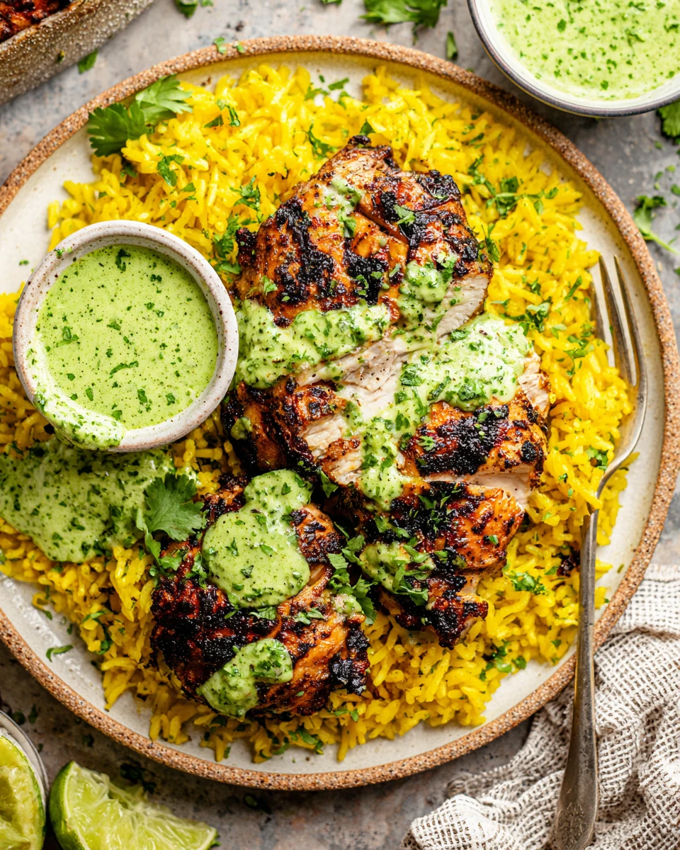 • Serve the rice topped with grilled chicken and green sauce.