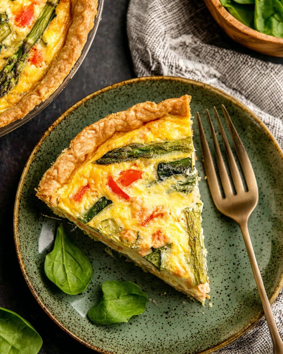 - Press the dough into a 9-inch pie plate, layer with flaked salmon, chopped asparagus, and cheese.