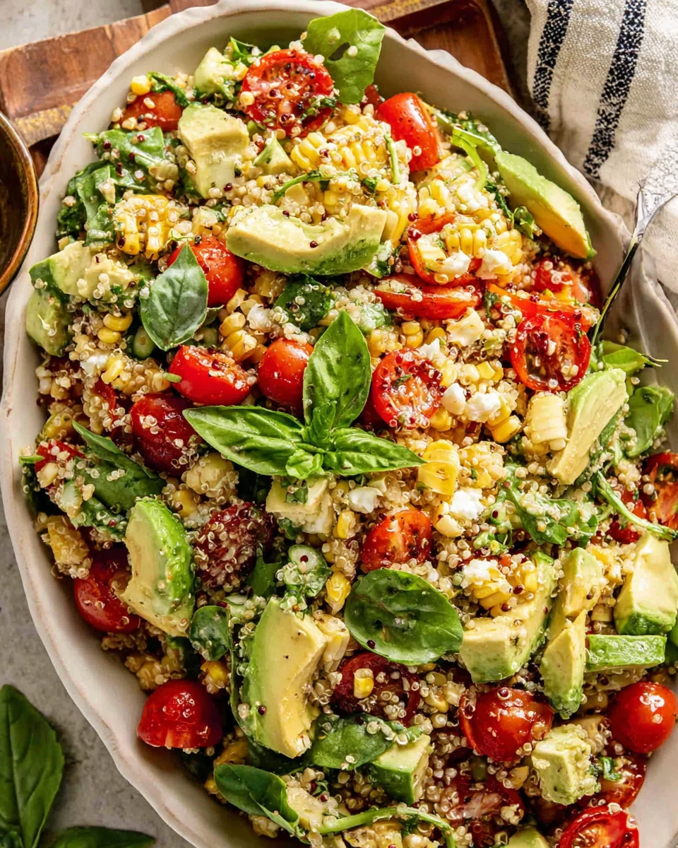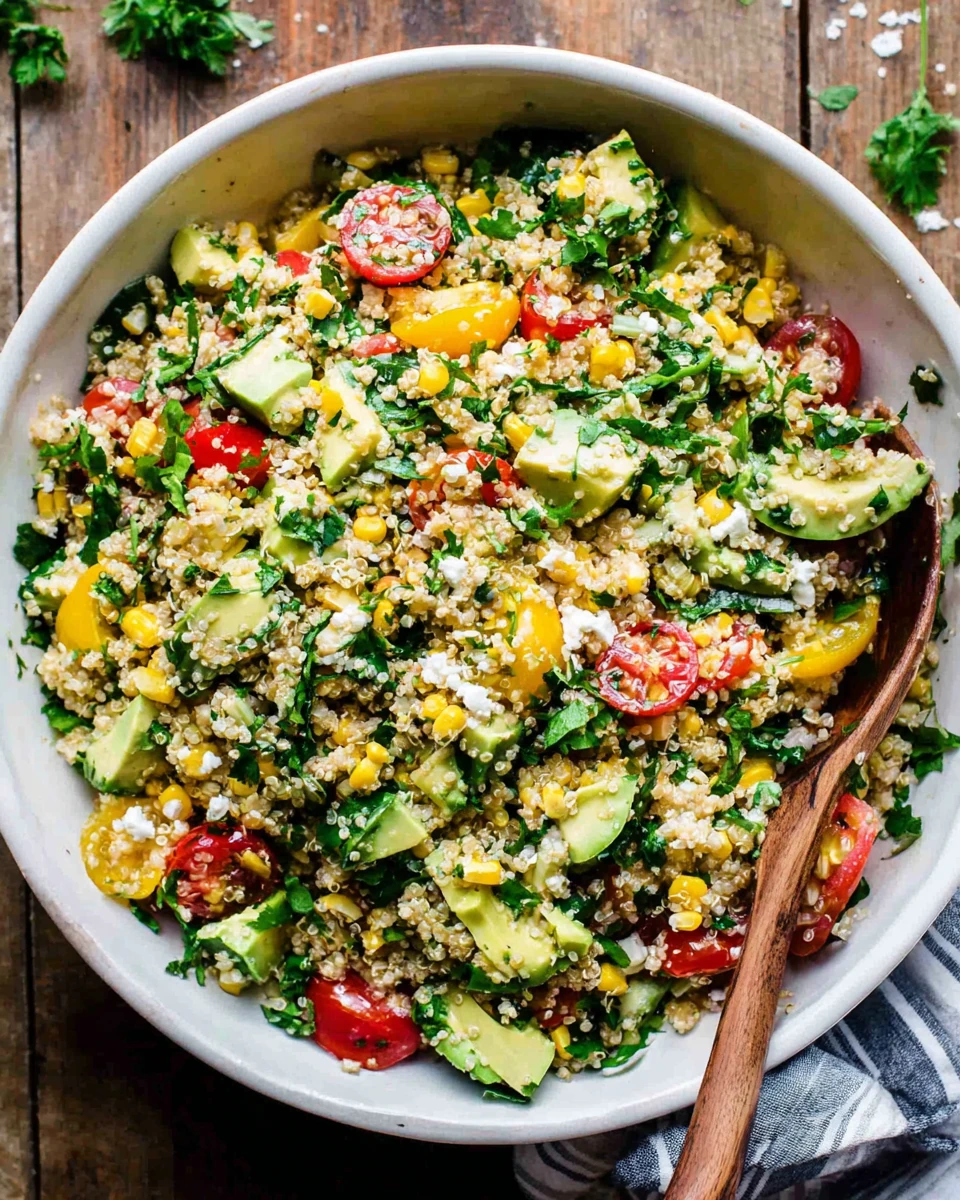 Preparing this salad is a breeze! Start by cooking the quinoa according to package instructions. While it’s simmering, grill your corn until it’s beautifully charred, about 10 minutes. Once the corn cools, cut the kernels off the cob. In a large bowl, combine the cooked quinoa, grilled corn, diced bell pepper, cherry tomatoes, avocado, red onion, and cilantro. Squeeze fresh lime juice over the top and season with salt and pepper to taste. Toss gently and serve immediately for the best flavor!