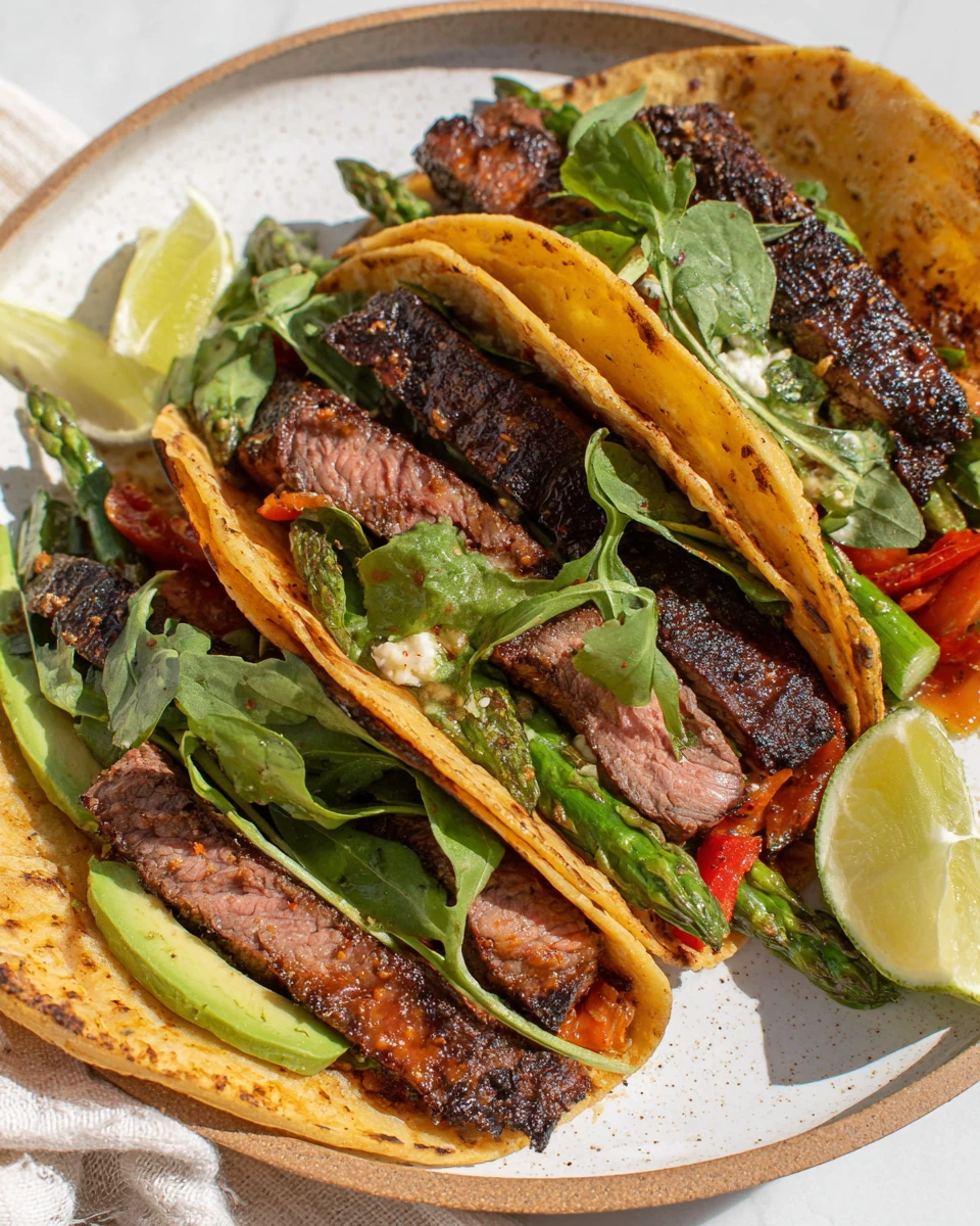 Remove the vegetables from the skillet and cook your marinated steak until it’s perfectly seared on both sides. Slice the steak against the grain for tenderness. Now comes the fun part! Lay out your warm tortillas and fill them with steak, sautéed veggies, and a squeeze of fresh lime juice. Top with cilantro before serving.