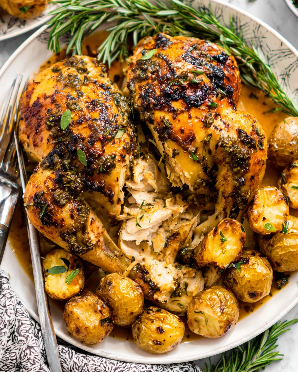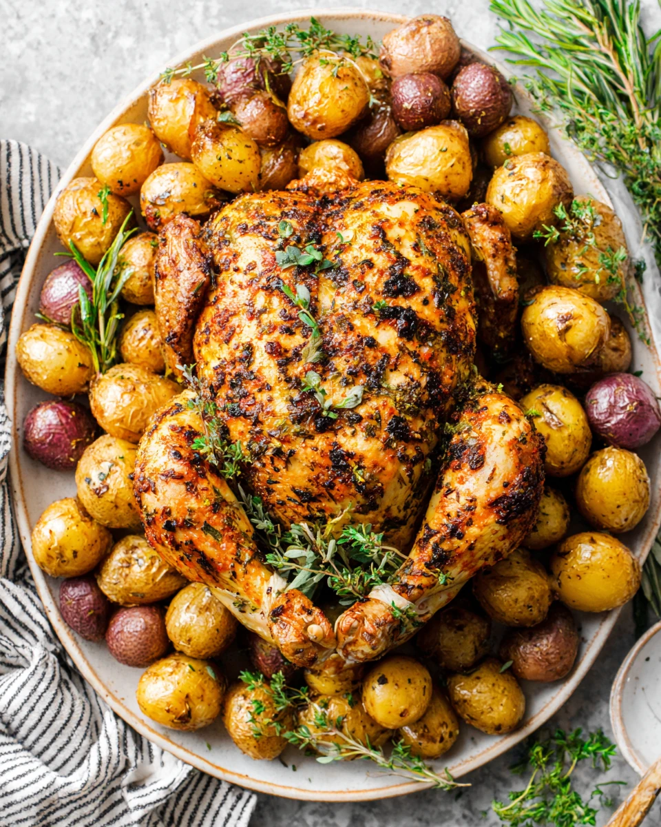 Place a cast iron skillet inside the oven to heat. Once ready, season the chicken with salt and pepper, then place it in the skillet. Roast for 30 minutes before lowering the temperature to 400°F. Add the baby potatoes around the chicken, pour the remaining herb oil over everything, and continue roasting for 45 to 60 minutes, basting every 15 minutes for that golden, crispy skin.