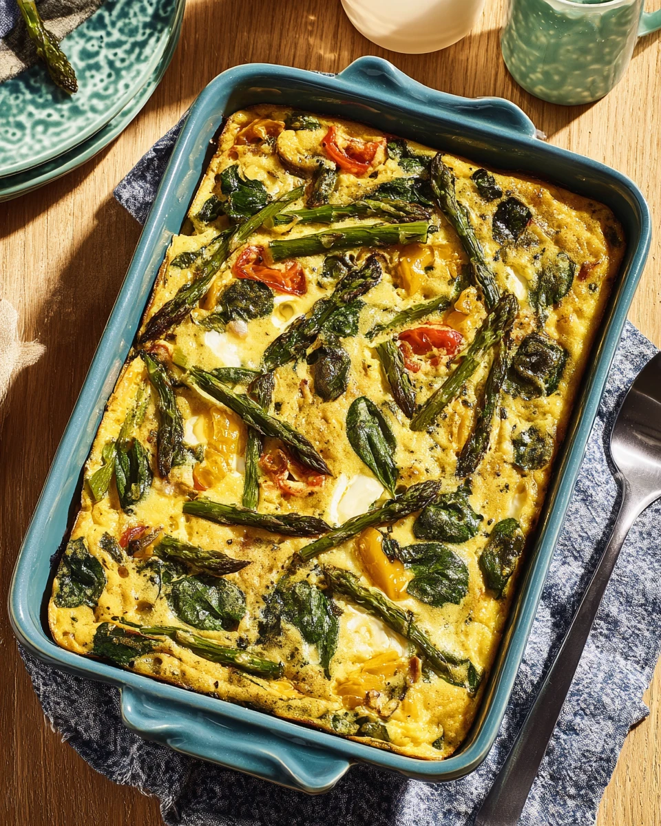 This vegetarian spring egg casserole stands out with its combination of seasonal vegetables and creamy egg mixture. The soft, fluffy texture of the eggs pairs beautifully with crisp asparagus, sweet bell peppers, and vibrant spinach. It’s a colorful dish that not only tastes great but also looks stunning on your table.